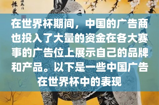 在世界杯期间,中国的广告商也投入了大量的资金在各大赛事的广告位上展示自己的品牌和产品。以下是一些中国广告在世界杯中的表现