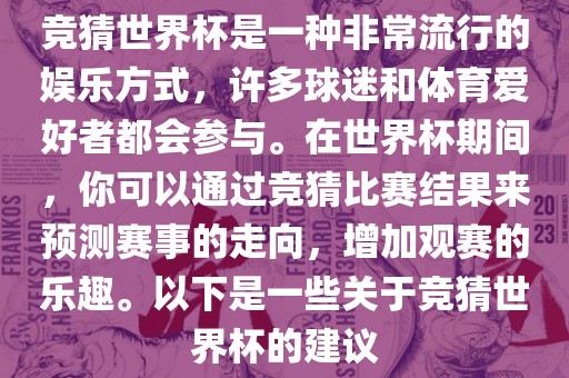 竞猜世界杯是一种非常流行的娱乐方式,许多球迷和体育爱好者都会参与。在世界杯期间,你可以通过竞猜比赛结果来预测赛事的走向,增加观赛的乐趣。以下是一些关于竞猜世界杯的建议