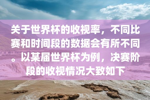 关于世界杯的收视率,不同比赛和时间段的数据会有所不同。以某届世界杯为例,决赛阶段的收视情况大致如下