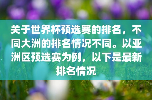 摘要:关于世界杯预选赛排名,各大洲情况各异。以亚洲区为例,最新的排名情况如下。随着比赛的进行,排名可能发生变化,请关注最新动态。