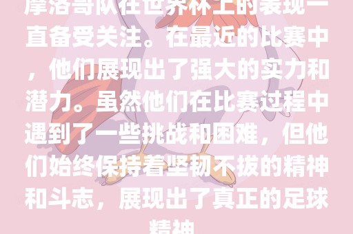 摩洛哥队在世界杯上的表现一直备受关注。在最近的比赛中,他们展现出了强大的实力和潜力。虽然他们在比赛过程中遇到了一些挑战和困难,但他们始终保持着坚韧不拔的精神和斗志,展现出了真正的足球精神。