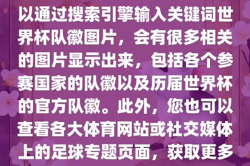由于无法直接提供图片,您可以通过搜索引擎输入关键词世界杯队徽图片,会有很多相关的图片显示出来,包括各个参赛国家的队徽以及历届世界杯的官方队徽。此外,您也可以查看各大体育网站或社交媒体上的足球专题页面,获取更多高清的队徽图片。