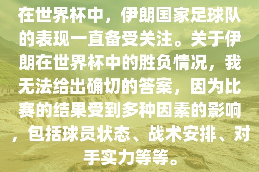 在世界杯中,伊朗国家足球队的表现一直备受关注。关于伊朗在世界杯中的胜负情况,我无法给出确切的答案,因为比赛的结果受到多种因素的影响,包括球员状态、战术安排、对手实力等等。
