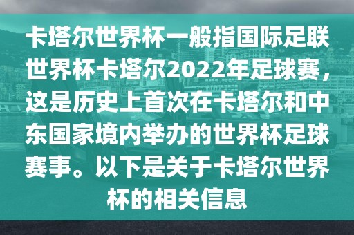 卡塔尔世界杯一般指国际足联世界杯卡塔尔2022年足球赛,这是历史上首次在卡塔尔和中东国家境内举办的世界杯足球赛事。以下是关于卡塔尔世界杯的相关信息