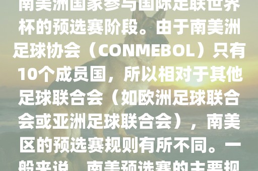 世界杯南美预选赛通常指的是南美洲国家参与国际足联世界杯的预选赛阶段。由于南美洲足球协会(CONMEBOL)只有10个成员国,所以相对于其他足球联合会(如欧洲足球联合会或亚洲足球联合会),南美区的预选赛规则有所不同。一般来说,南美预选赛的主要规则如下
